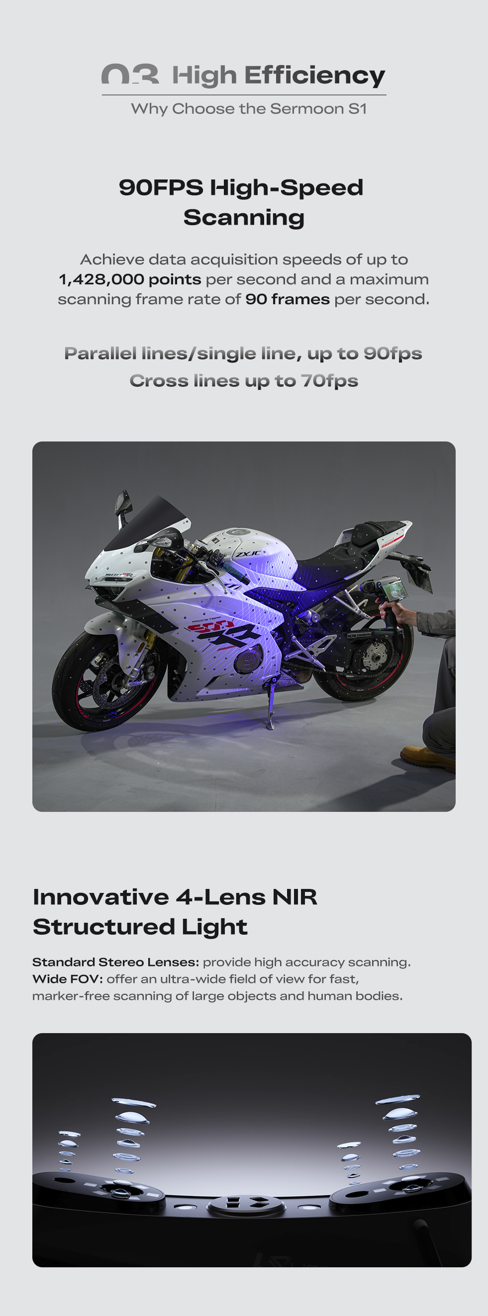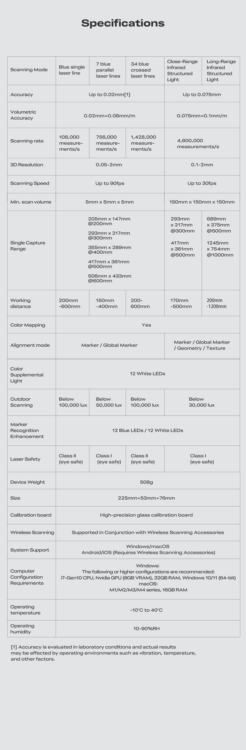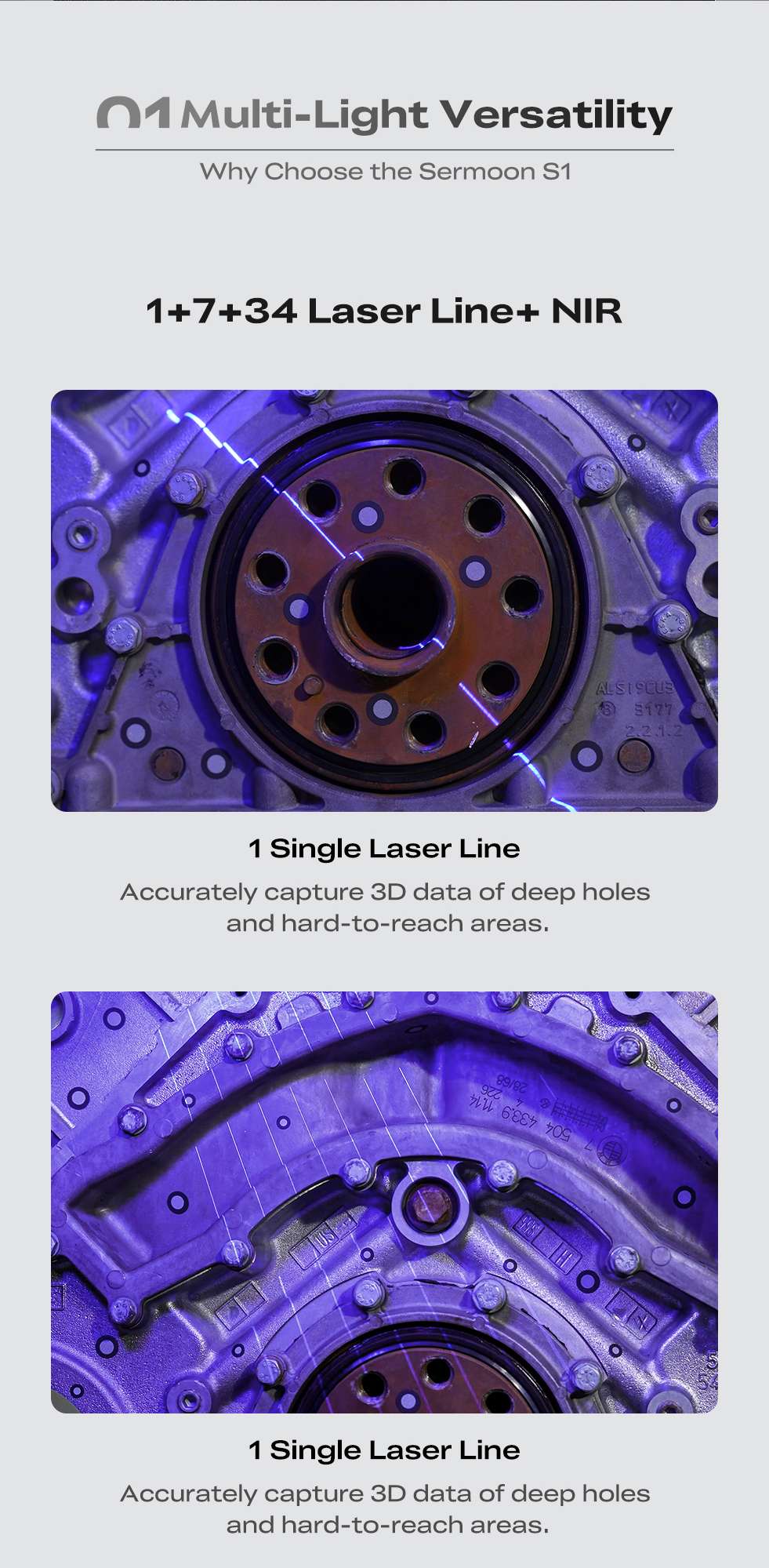 - Гибридная технология сканирования: Синий лазер (1/7/34 линии) + ИК-структурированный подсвет