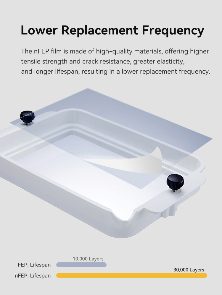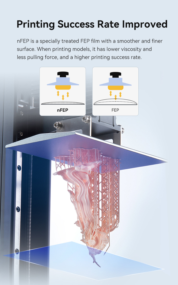• Повышенная надежность печати: Более гладкая и утонченная поверхность nFEP обеспечивает меньшее сопротивление при отслоении и снижает усилие отрыва, что повышает процент успешных печатей.