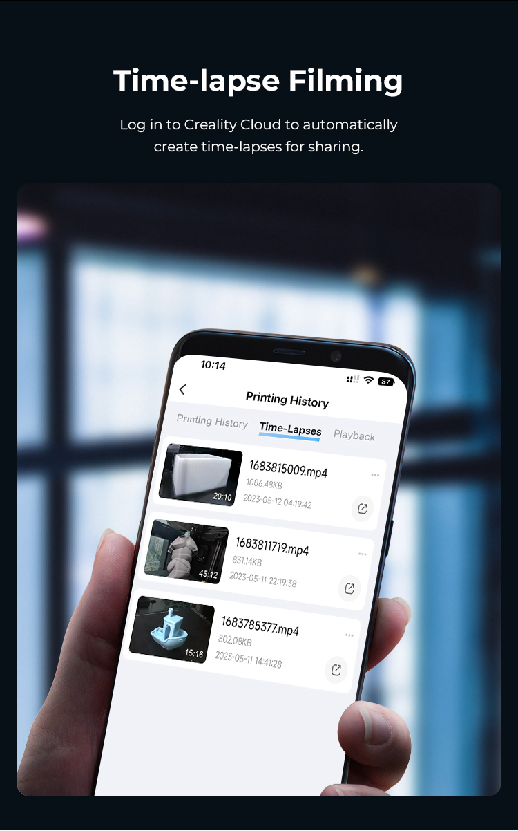 - Создание таймлапсов: Автоматическое создание замедленных видео всего процесса печати для последующей публикации через облачный сервис.
