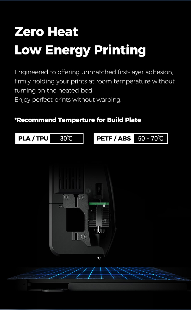- Печать без нагрева: Высокая адгезия первого слоя и удержание модели достигаются при комнатной температуре, что позволяет не включать подогреваемый стол и экономить энергию.