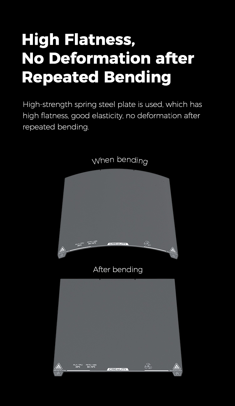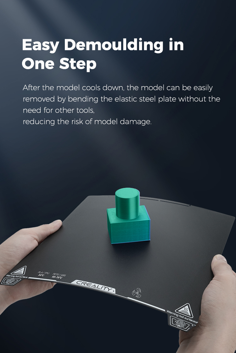 - Легкое отсоединение моделей: После остывания модель легко снимается путем изгибания эластичной стальной пластины без использования дополнительных инструментов, снижая риск повреждения отпечатка.
